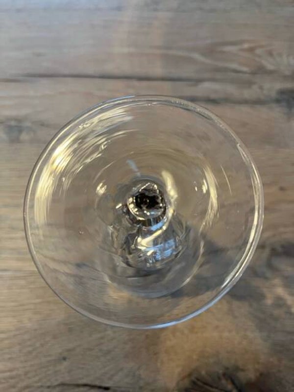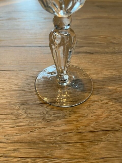 Antiek gegraveerd wijnglas met gefacetteerde stam en gefacetteerde bolknop. Het geheel staat op een platte voet.
