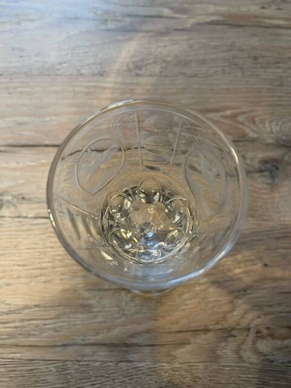 Gegraveerd decor met driemaal een radgravure van een duif in medaillon. De gehele kelk is daarnaast gedecoreerd met gefacetteerde vormen.