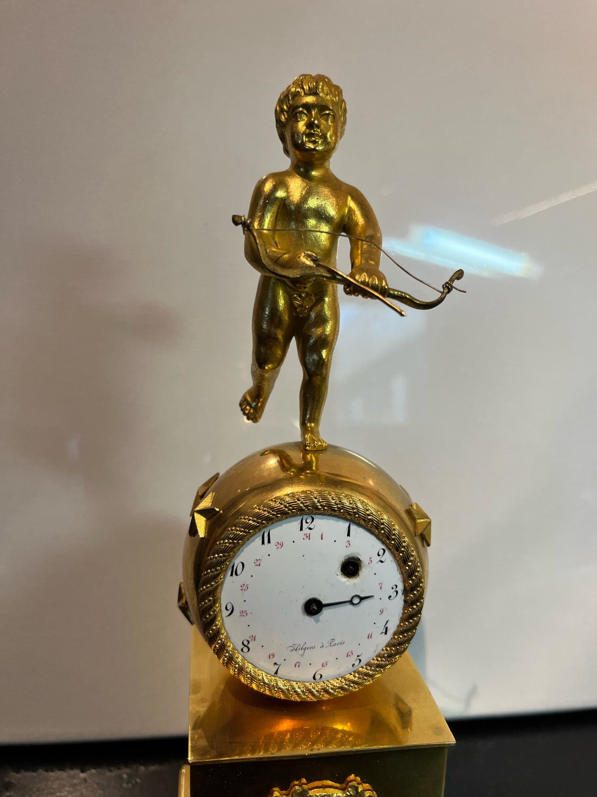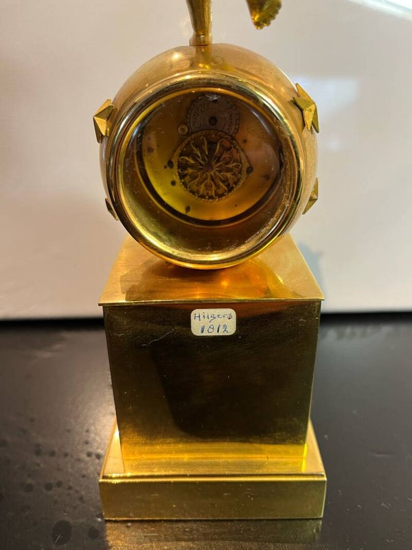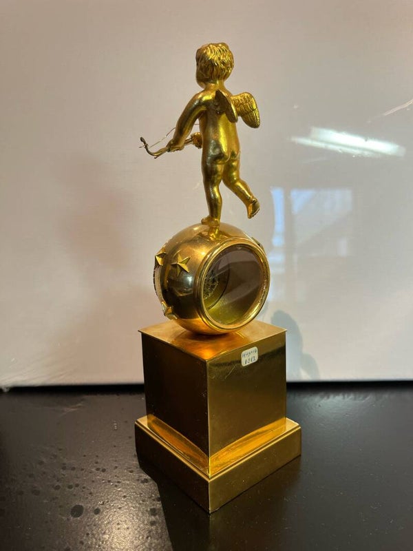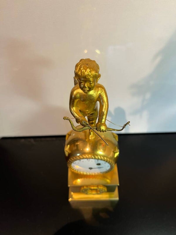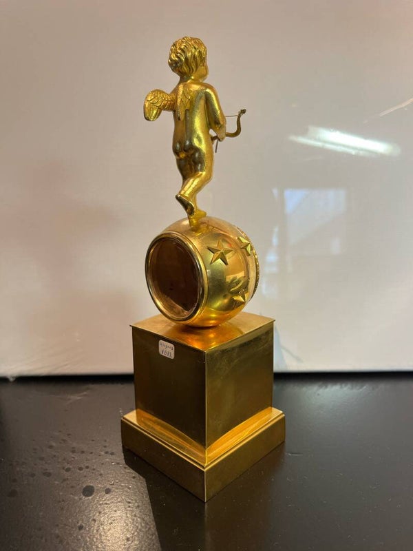Antieke vuurvergulde pendulette met horloge uuwerk in bolvormige behuizing bekroond door Amor.Emaille wijzerplaat met de tekst "Hilgers a Paris"Herkomst: FrankrijkDatering: circa 1810Formaat: 22 cm hoogGeen opwindsleutel erbij.